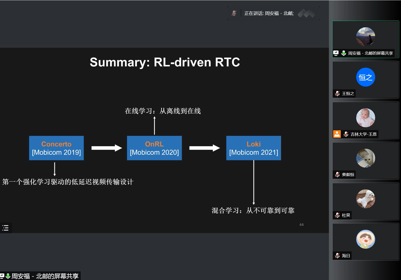 在讲座中,周老师以提高低延迟视频传输服务中的用户体验质量(QoE)这一基本问题开场,深入浅出地介绍了和淘宝直播开展的大规模测量研究,之后针对测量中发现的问题设计了基于强化学习理论的低延迟视频传输控制算法,并创新型地提出了在线学习和混合学习模式。随后,周老师具体介绍了如何解决强化学习与实时视频传输交叉结合引起的新挑战,如应用层-传输层码率不协调(MobiCom 2019)、仿真-显示差异((MobiCom 2020)、QoE长尾效应(MobiCom 2021)等。